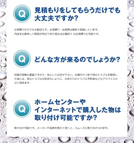 蛇口交換、水漏れ修理、排水つまり、パッキン交換、カートリッジ取り替え、シャワー水栓の交換工事を行なっている会社です。